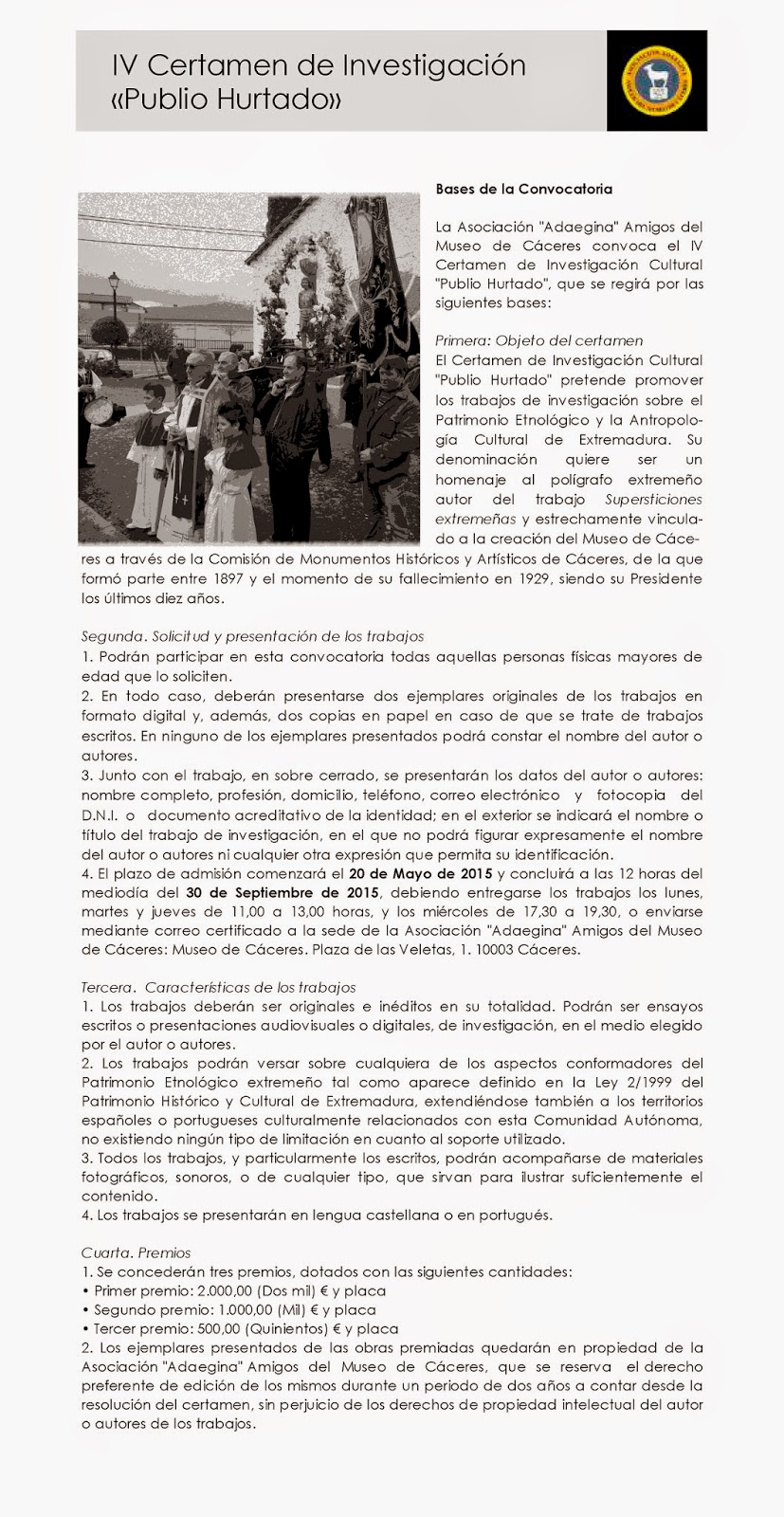 Bases de la convocatoria del IV Certamen de Investigación "Publio Hurtado"sobre Patrimonio Etnológico y la Antropología Cultural en Extremadura, promovido por la Asociación Adaegina de Amigos del Museo de Cáceres.